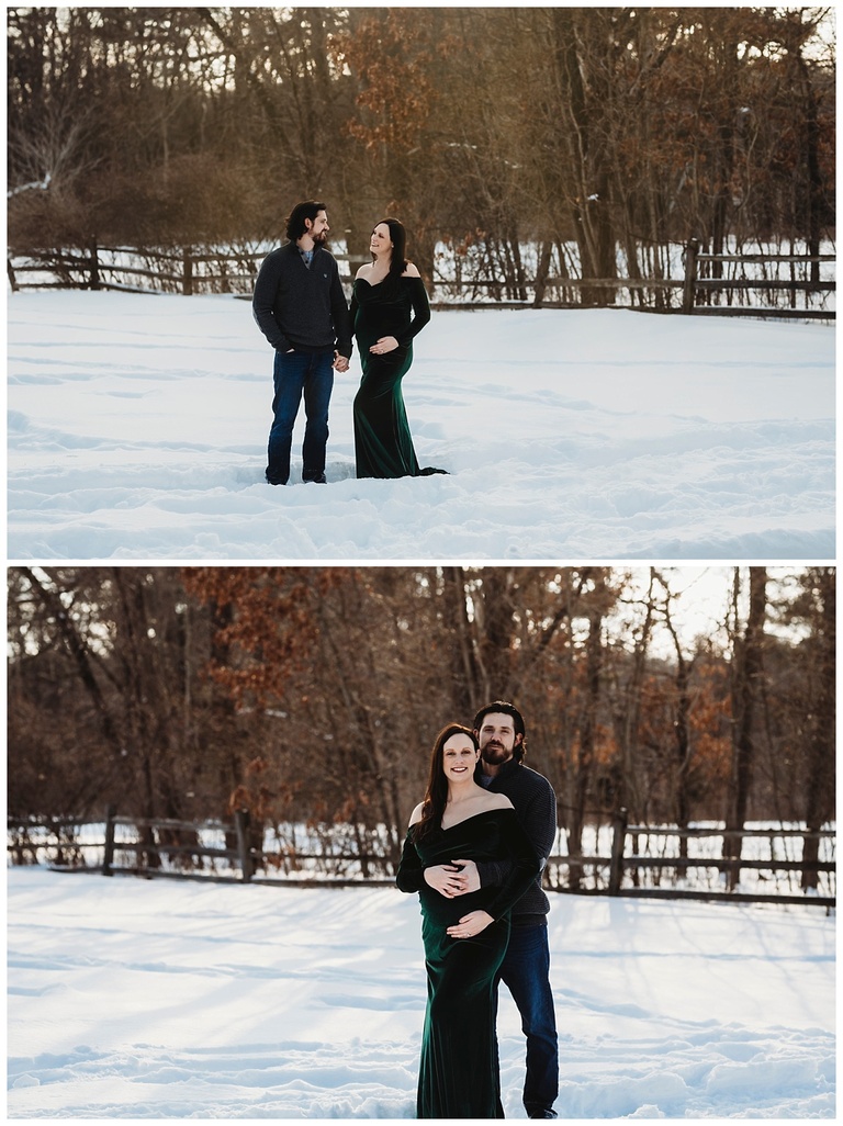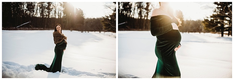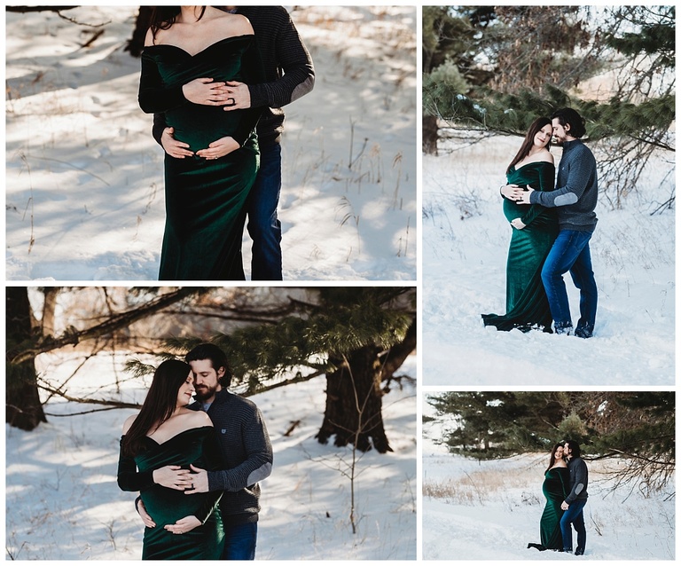 The sun was shining, the weather was not too cold and lots of people were out enjoying the above average snowy day here in Metro Detroit and I was so lucky to work with one beautiful family for their maternity session. I really enjoyed working with the Kowalczyk family and getting to know them and capture their love for one another and their growing family. We were a bit nervous on how big brother to be was going to handle the shoot, but he did amazing and had so much fun being able to play in the snow and watch mommy and daddy take some gorgeous portraits together. Mom chose one of my beautiful green velvet dresses and I honestly want to add more velvet dresses to my client closet because man do those beauties photograph beautifully. Don’t you agree? Check out this gorgeous family maternity session and lets connect to get you the same thing Mama!