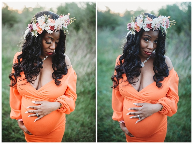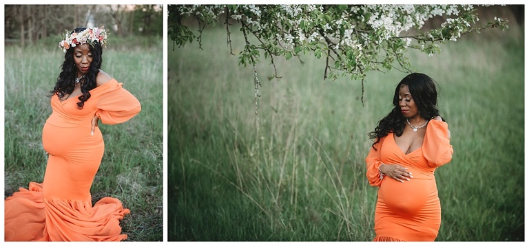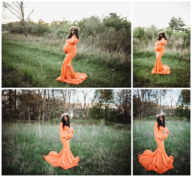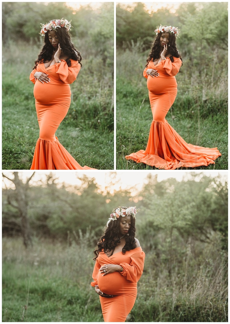 I met Mary and her daughter on a beautiful spring day for Mary’s maternity session and nature did not disappoint. Mary chose one of my gowns which is the mauve color and then pulled out her own that she brought with her and realized that orange one was the same style dress! We had such a good laugh about it.