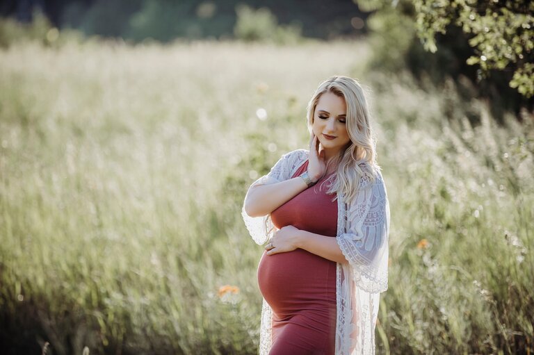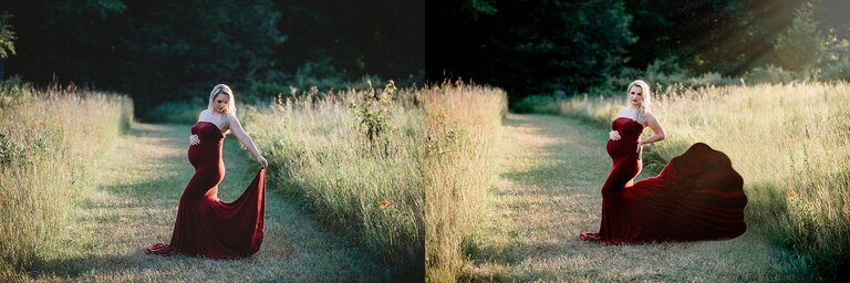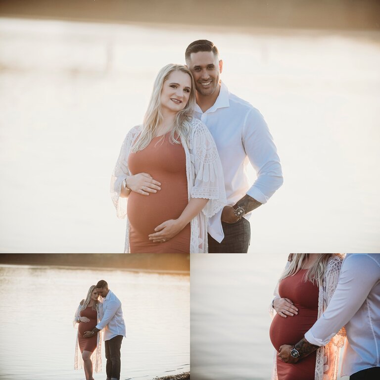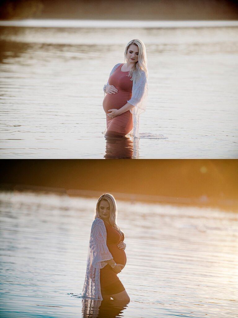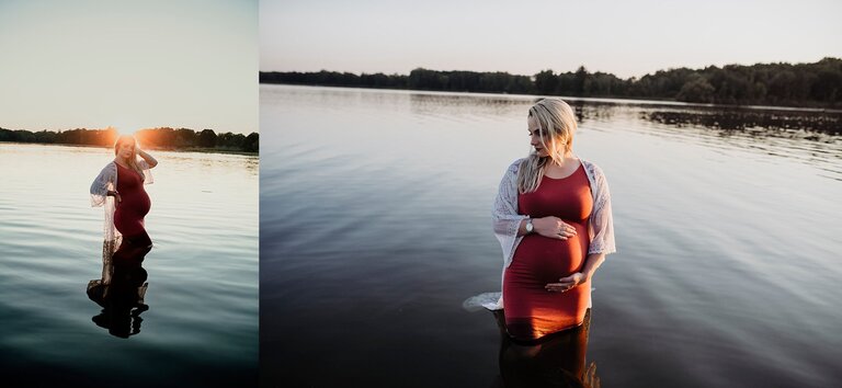 This maternity session gave me all the feels!! The weather was just perfect and Kati was just stunning. When mama’s to be get out of the car rocking the cutest outfits ever with the best little baby bumps, it gets me so pumped to do their session! Kati started off wearing the cutest little white crop top paired with a super cute long skirt. This outfit photographed beautifully out in the open fields. She also chose one of my red strapless gowns from my client wardrobe that made her look like a goddess. Check out that gown flowing in the air that her husband helped me achieve. As I mentioned, the weather was just spectacular, it was not blazing hot that we had been experiencing for days on end. It was a picture perfect evening for the Hess’s maternity session. Their session took place out of Stony Creek Metro Park, where I frequent all to often during the summer and fall months and concluded at the beach where my love for shooting in water is deeply awaken! There is nothing more gorgeous than that evening sunlight hitting that water just right and creating that beautiful golden glow.