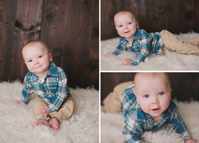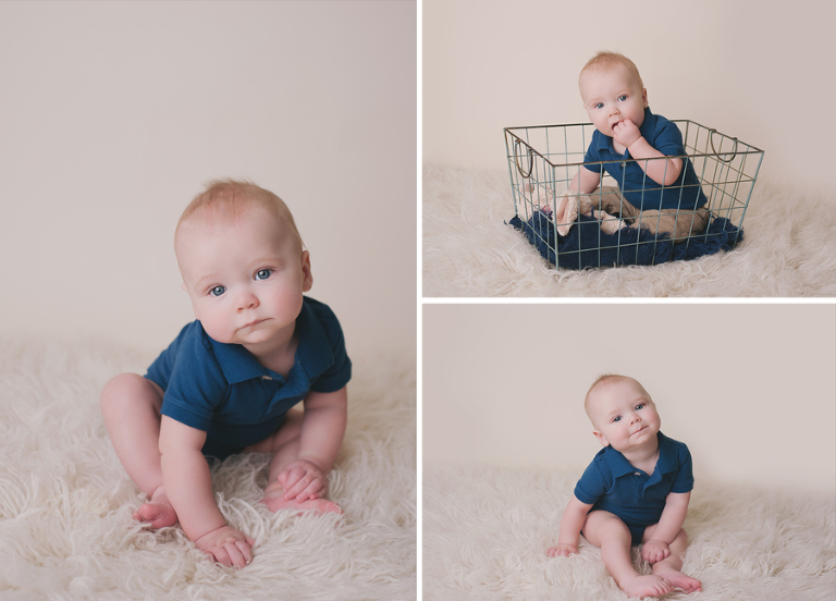 I had pleasure of meeting a new family that is brand spanking new to the state of Michigan. Just arriving only a few short months ago, they have definitely traveled around the country. Secretly I am kind of jealous since I’ve only lived here my entire life. Caden who is normally a very smiley guy was tired from his almost hour drive to my studio but he still hammed up the camera and didn’t hardly let out a cry the entire time he was here. I absolutely love the naturalness of his session and am so pleased to give you a sneak peak into his super cute 6 month session. Enjoy 🙂